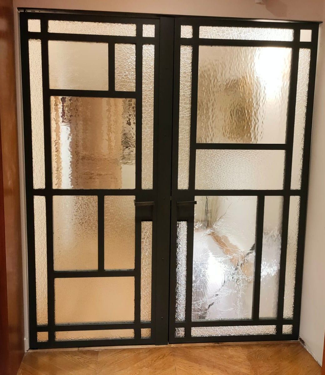 Fabrication d'une porte acier asymétrique avec verres décoratifs